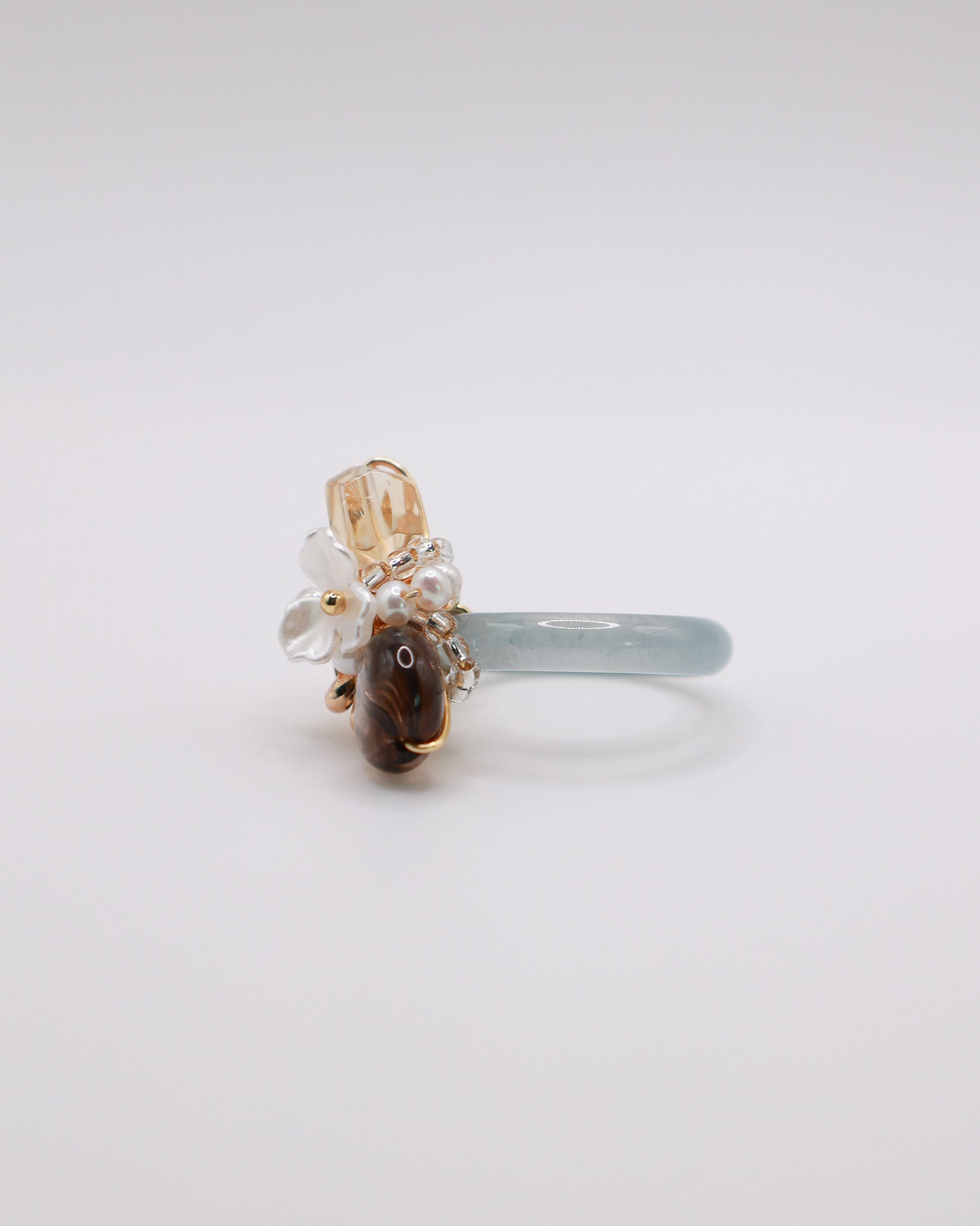 Type A Guatemala Jade Ring, Smoky Quartz, Citrine, Clear Quartz, Freshwater Pearls, Japan Imported Glass Beads