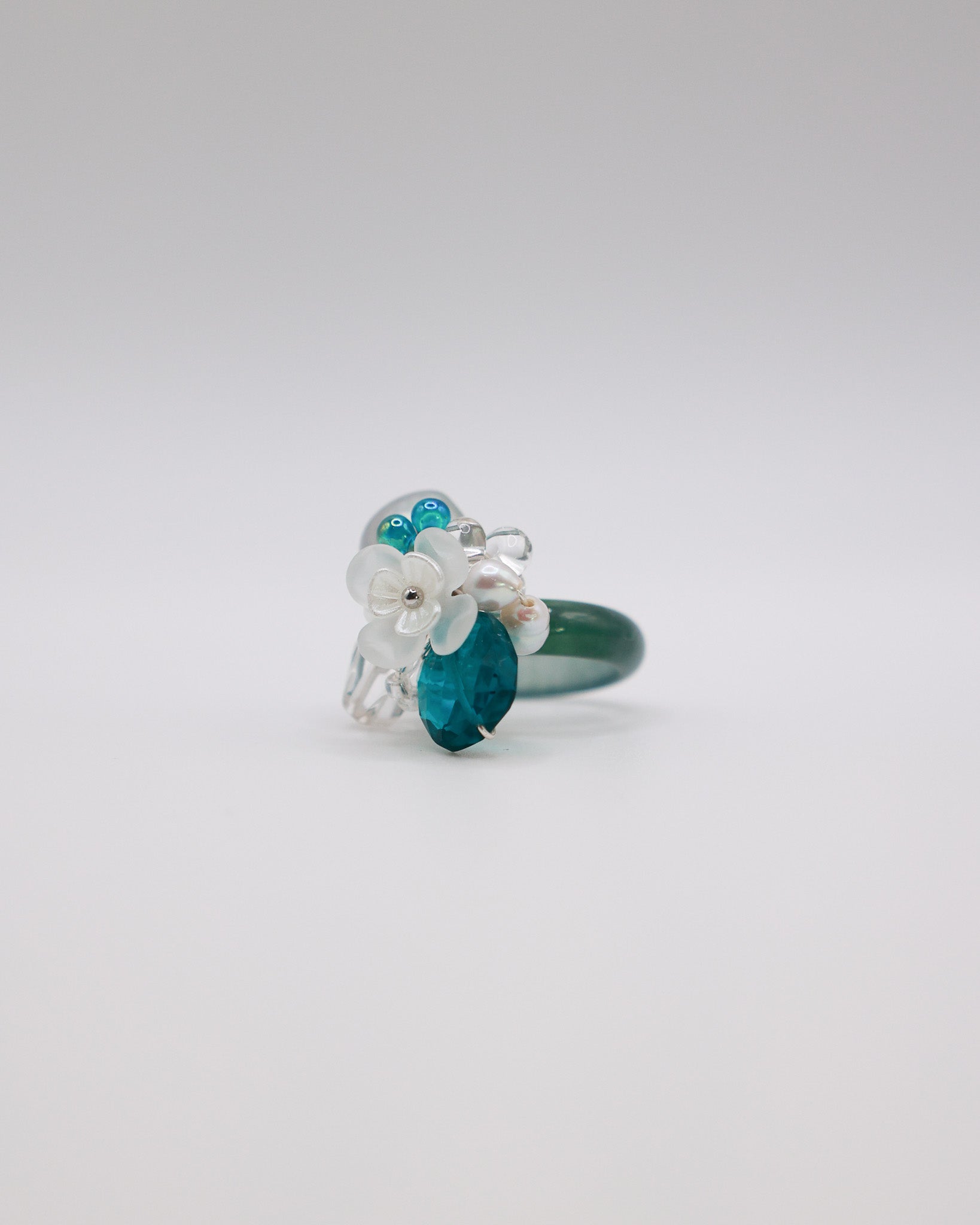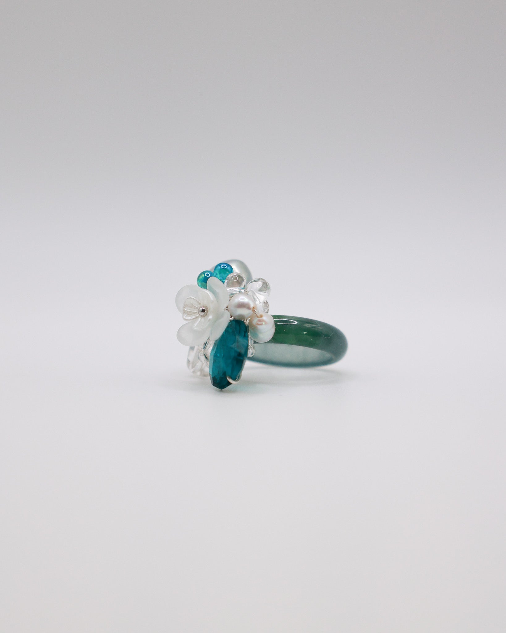 Type A Guatemala Jade Ring, Freshwater Pearls, Clear Quartz, Emerald Blue Manmade Quartz, Japan Imported Glass Beads