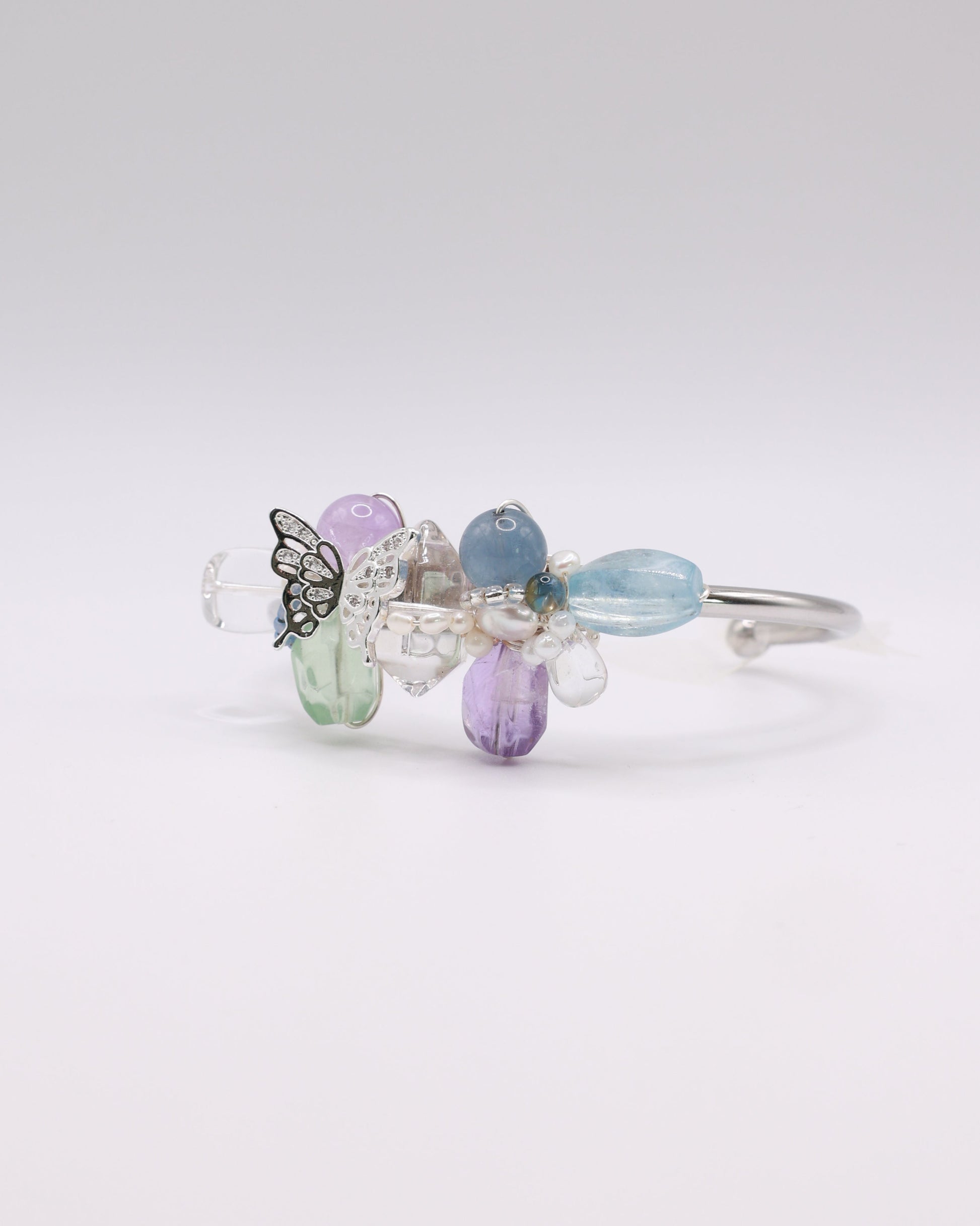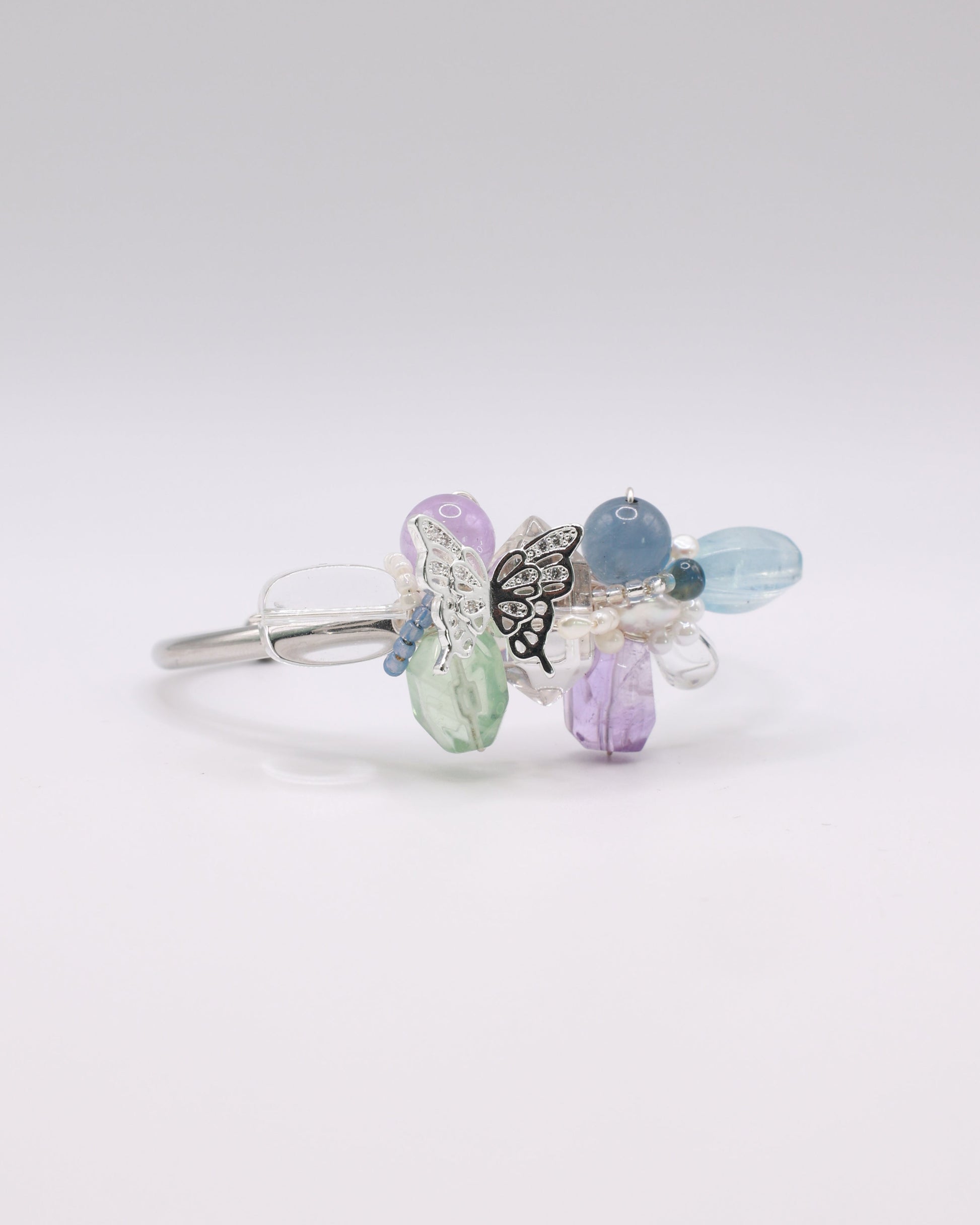 Celestial Garden shimmers with dreamlike serenity, where soft purples, greens and blues dance in harmony. The lustre of freshwater pearls meets the delicate presence of a silver butterfly, bringing a spark of enchantment to the piece.