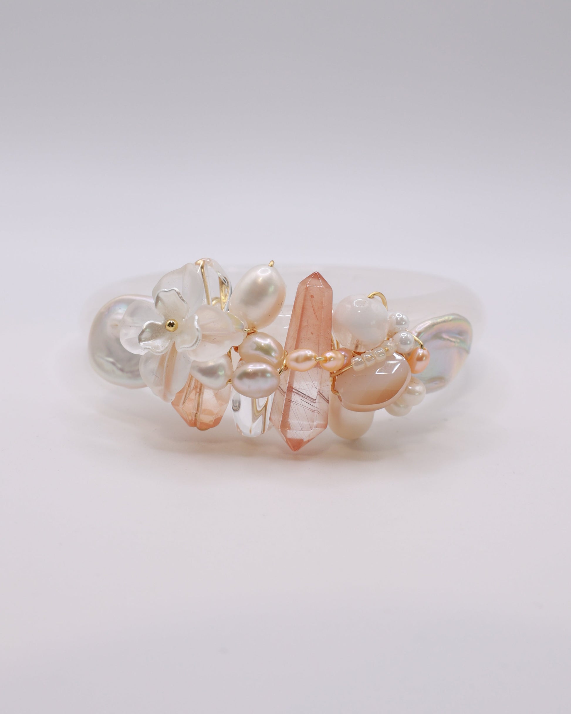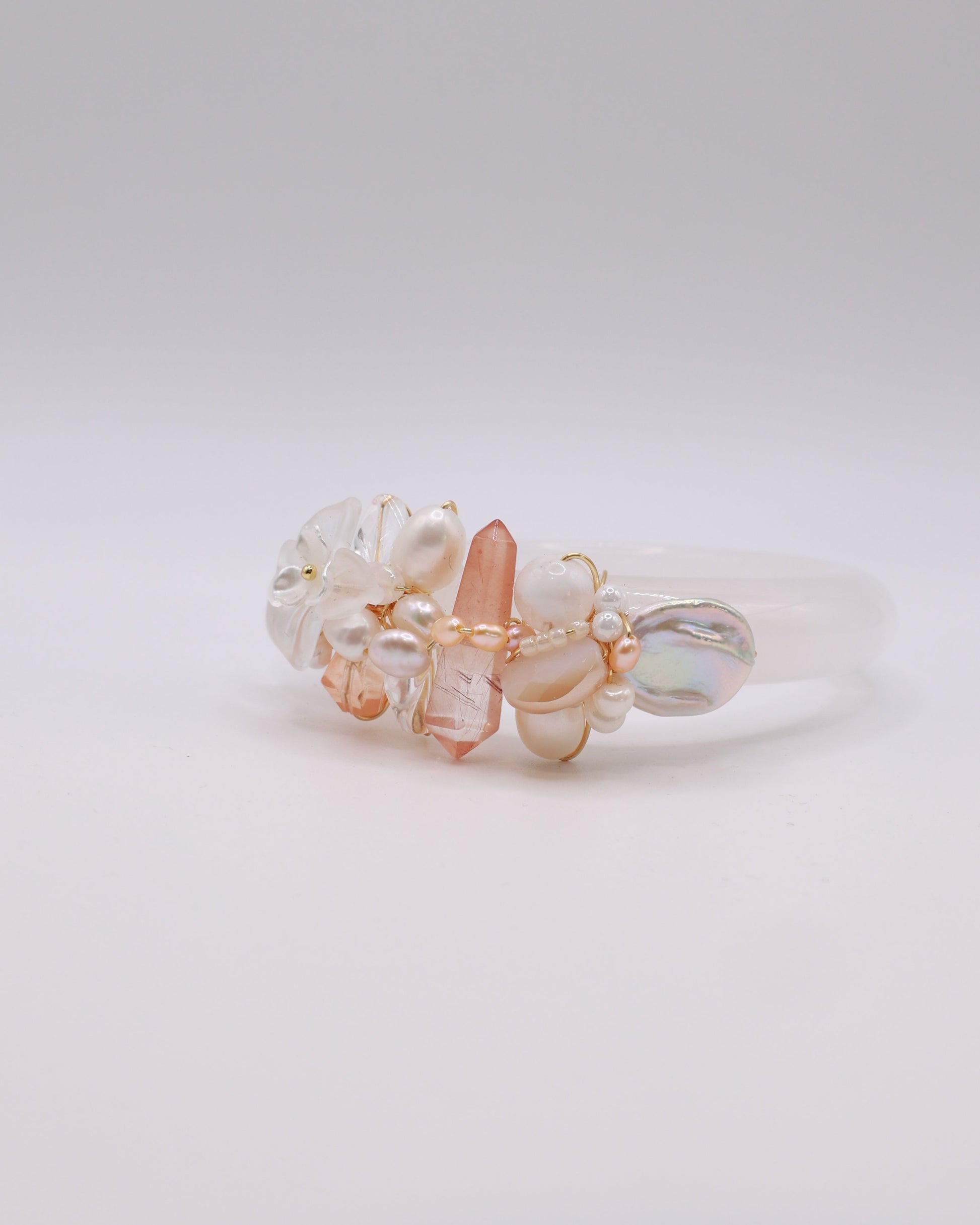 White Phantom Quartz Bangle, Freshwater Pearl, Clear Quartz Hand-Carved Clover Flower, Red Rabbit Hair Quartz, Clear Quartz, Snow Phantom, Japan Imported Glass Beads