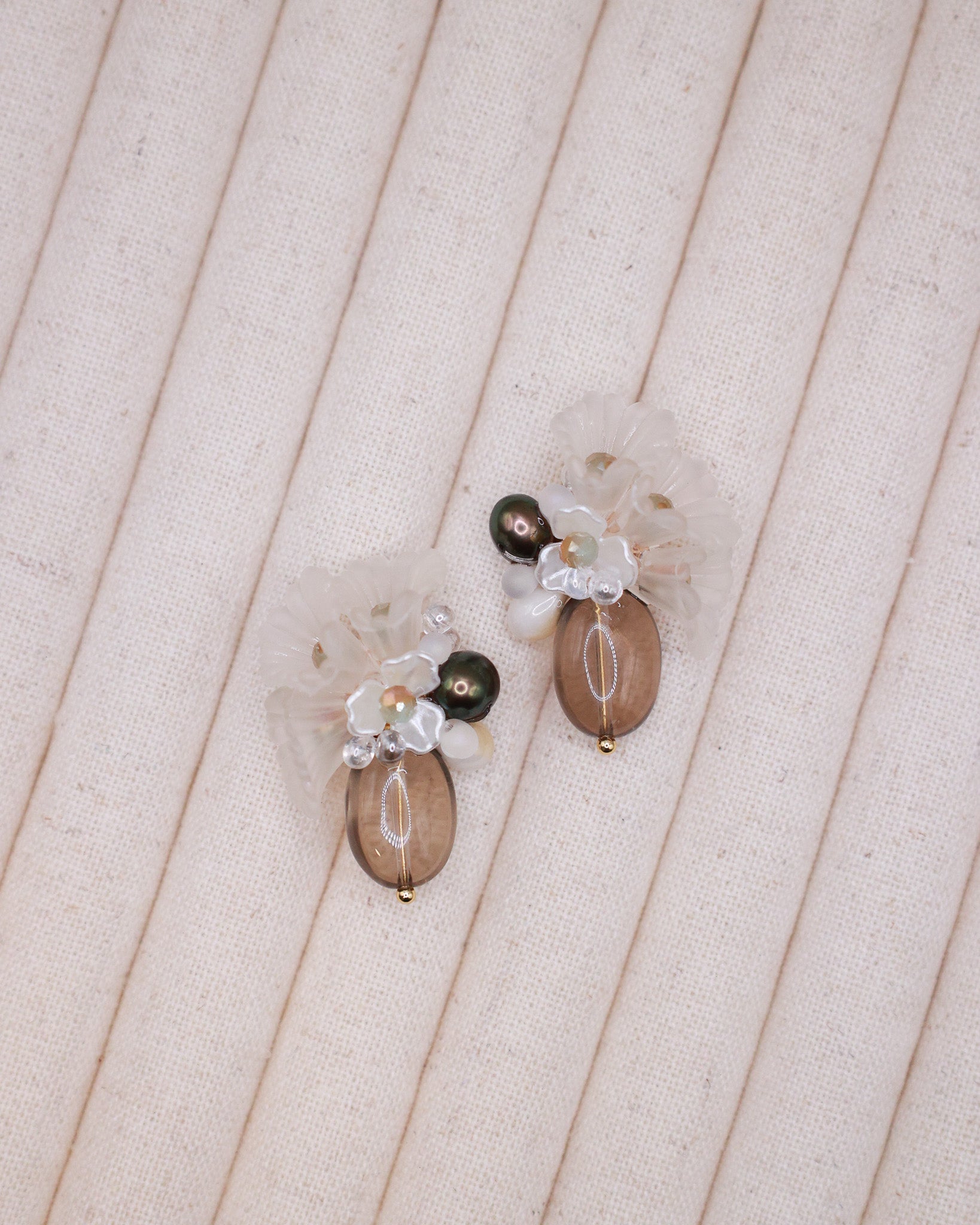 Smoky Quartz, Electroplated Olive Brown Freshwater Pearl, Japan Imported Glass Beads, Gold vermeil earring studs (gold plated over S925)