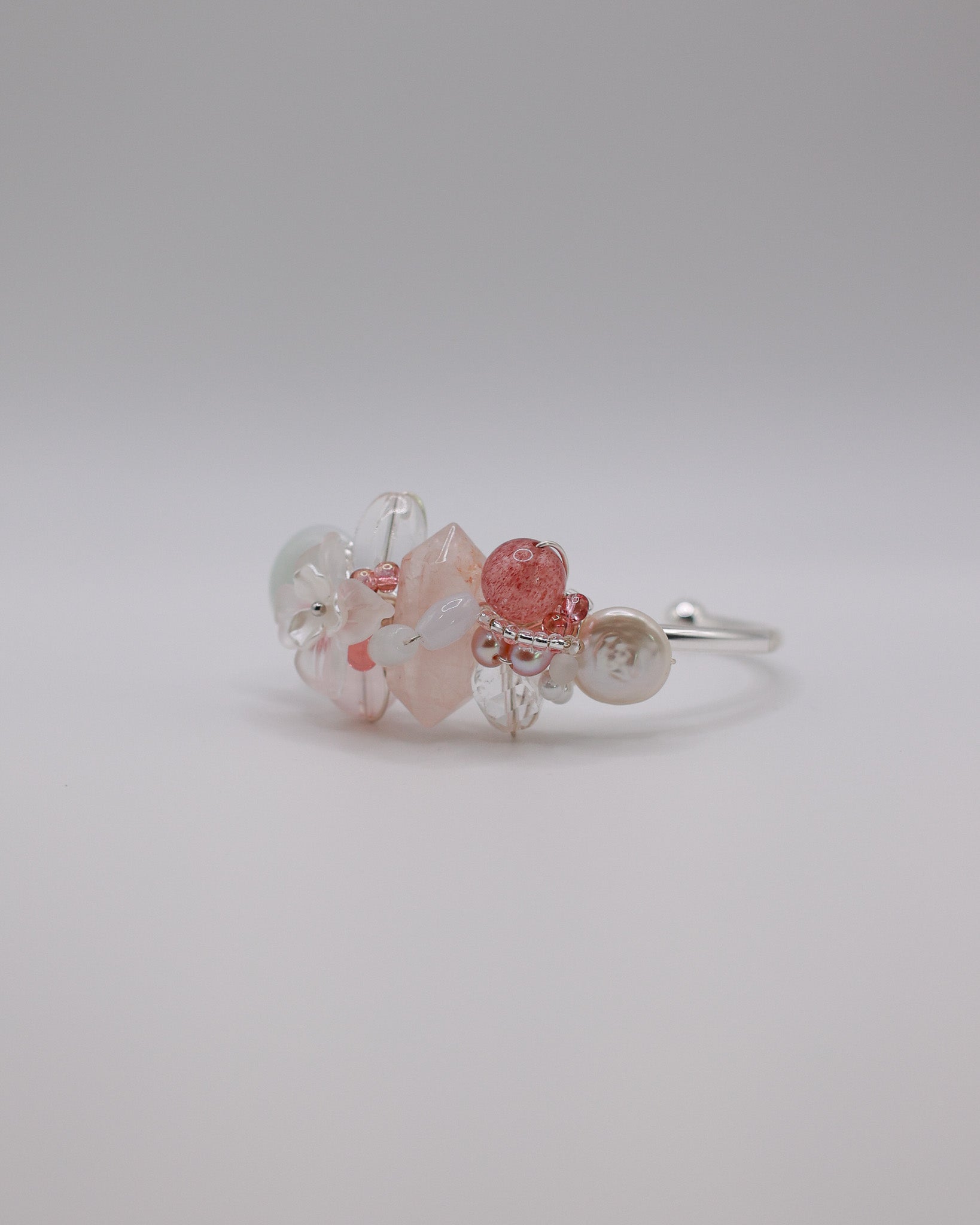 Type A Burmese Jade Donut and Mini Barrels, Clear Quartz Hand-Carved Flower, Clear Quartz, Rose Quartz, Pink Hematoid Quartz, Strawberry Quartz, Freshwater Pearls, Japan Imported Glass Beads