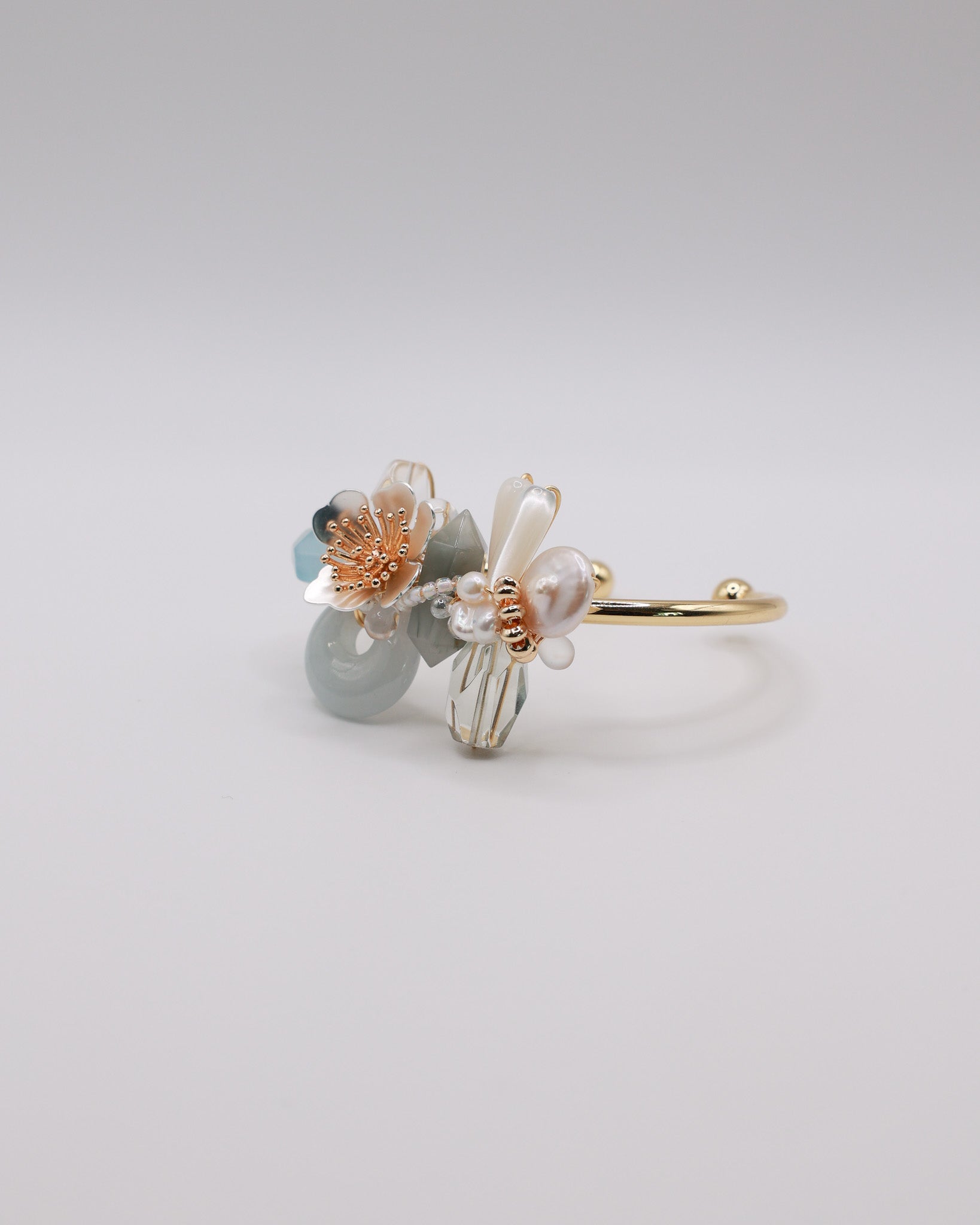 Ethereal Air drifts in shades of blue and clear light — calm, weightless, and serene. Jade, aquamarine, and blue rabbit hair quartz add depth, while prasiolite and clear quartz bring a touch of airiness. Finished with a white and gold double-flower accent, it’s designed to feel light and composed.
