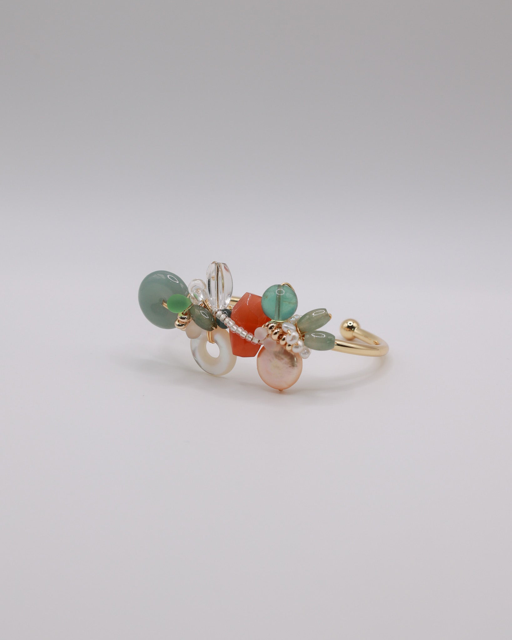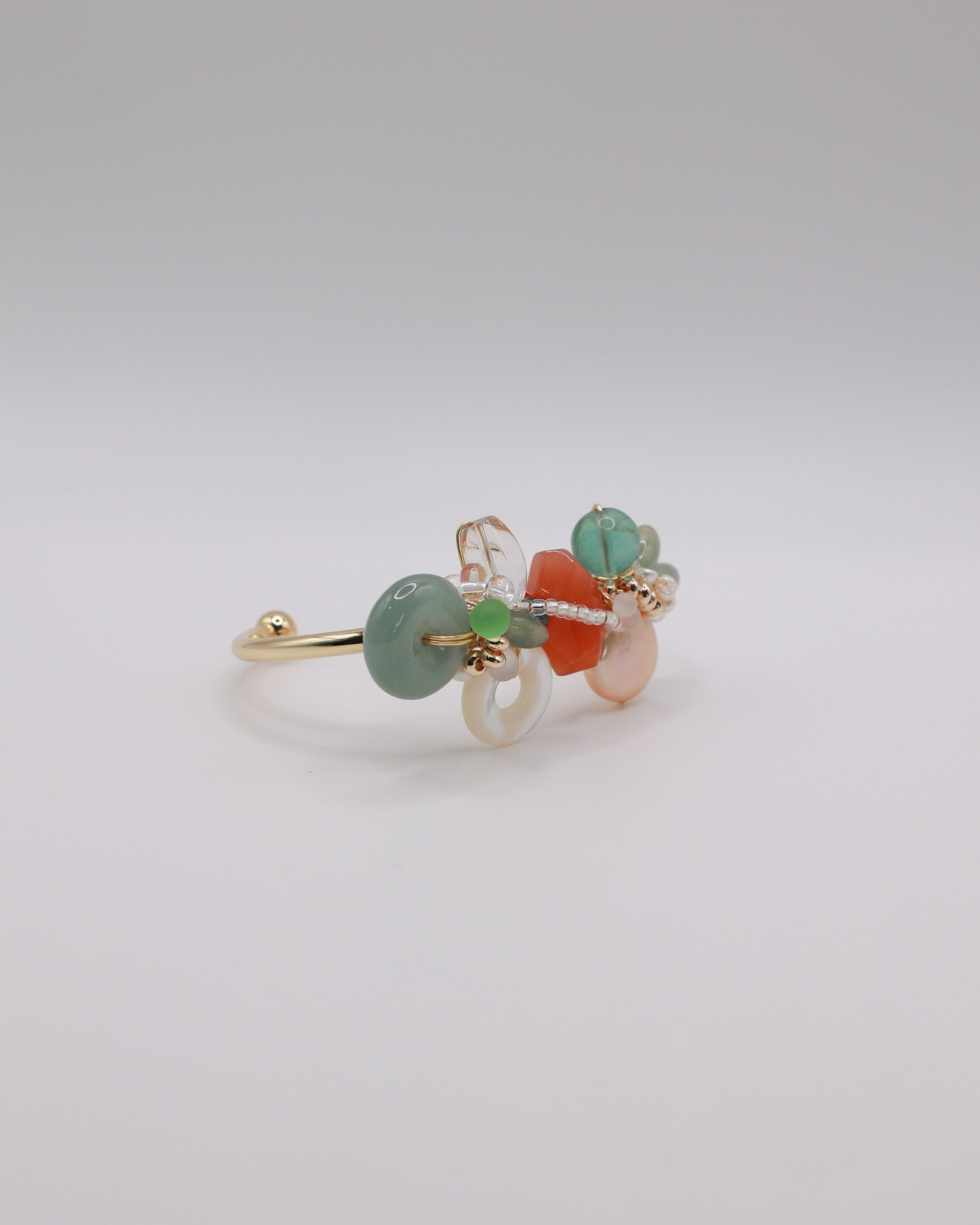 Showgirl Muse borrows the colour palette of Taylor Swift’s TLOASG album — expressed in richer contrast and deeper hues. Coral, jade, and white meet the luminous green of fluorite and the warmth of gold. The mix of jade, quartz, and shell catches the light with ease, creating a piece that feels confident, radiant, and full of allure.
