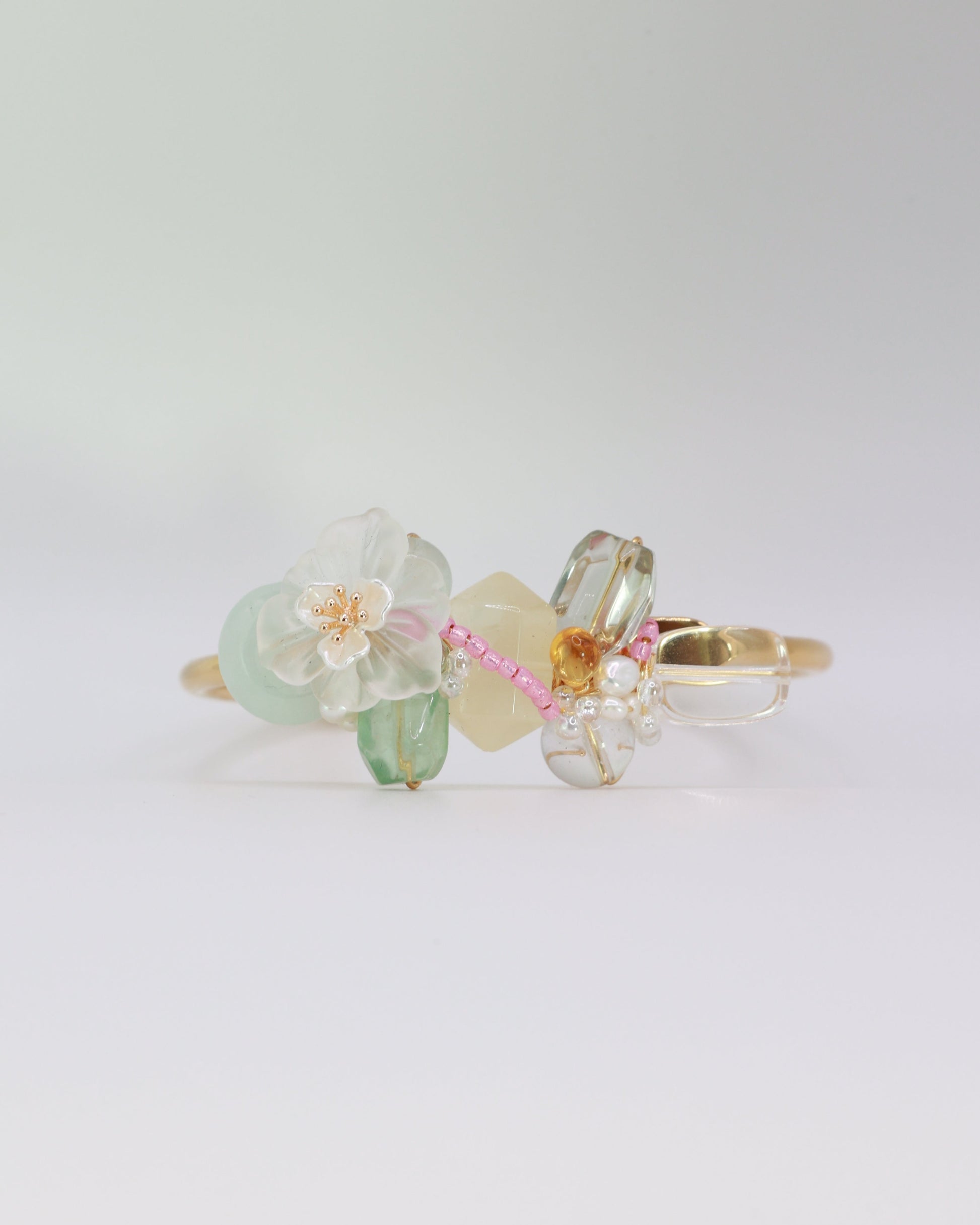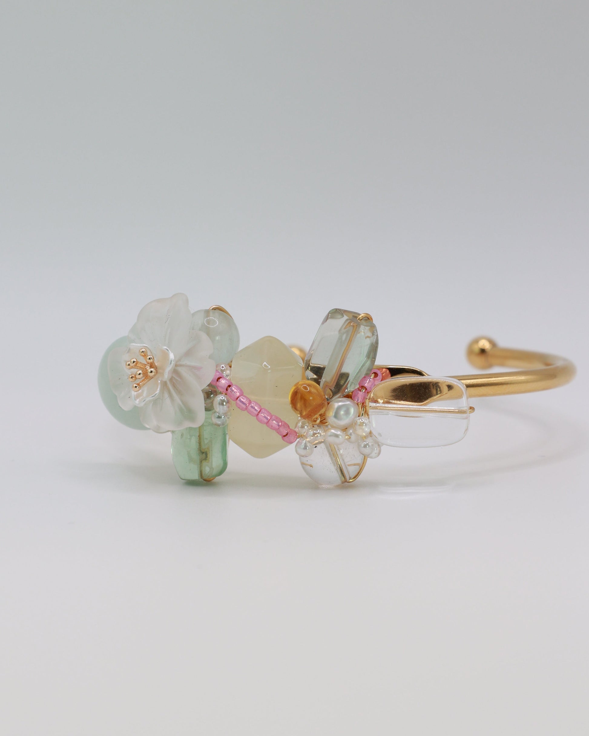 Minty Lime Soda shimmers with a cool, zesty freshness. At its heart, a clear quartz hand-carved flower blooms like crystal sugar in a sparkling green soda, surrounded by jade and fluorite tones that feel vibrant and uplifting.