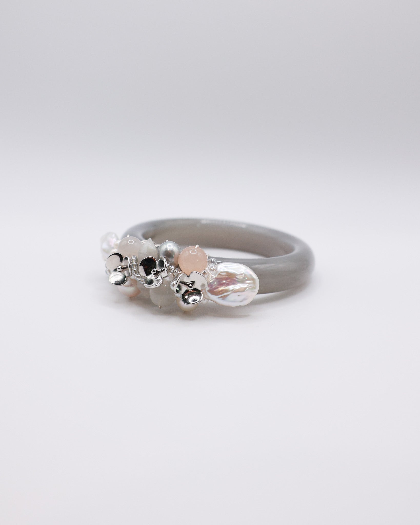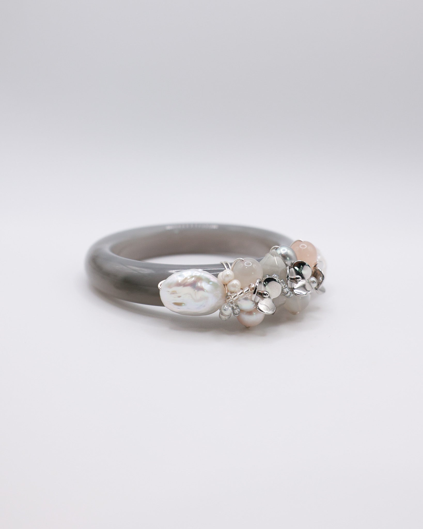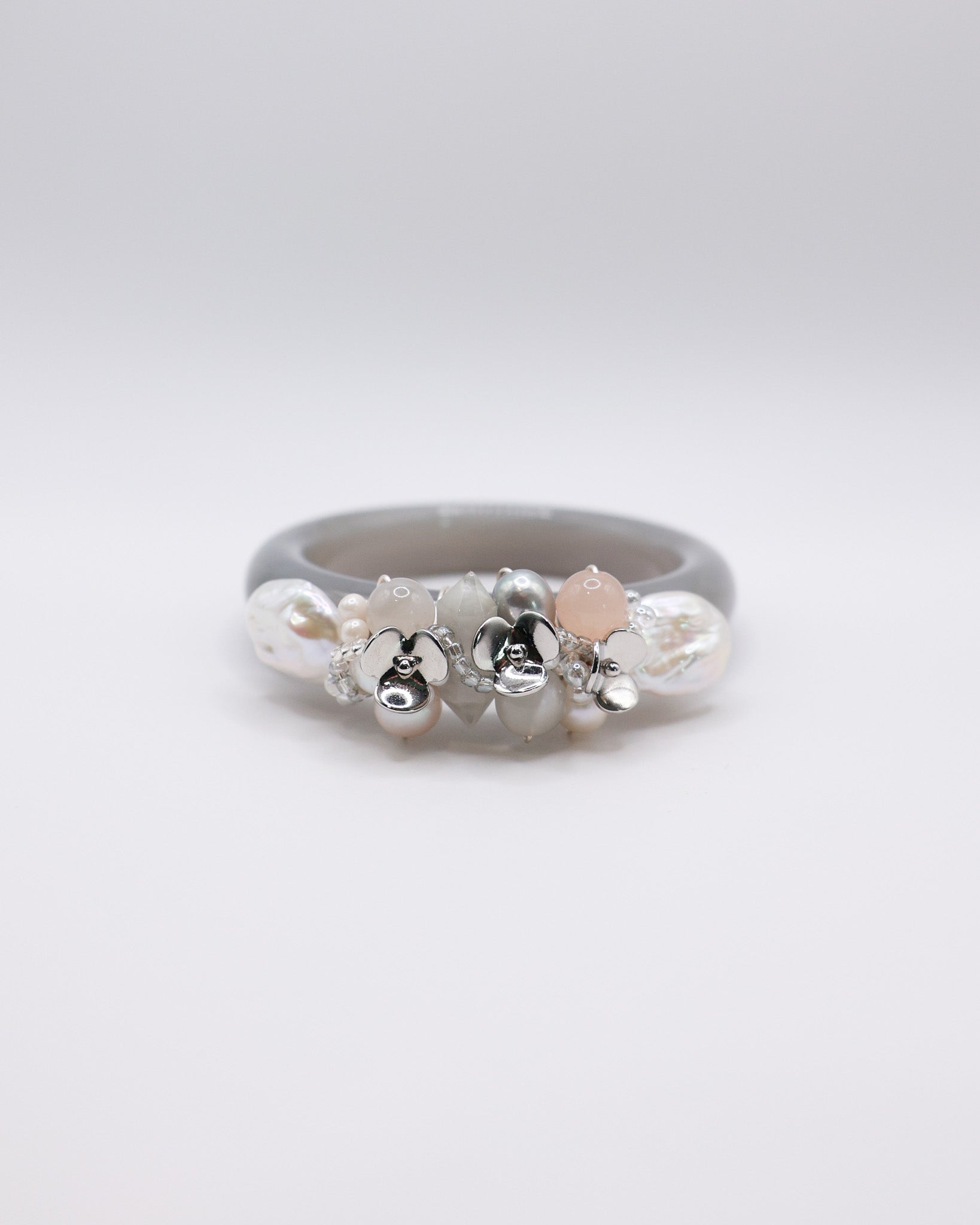 Freshwater Pearls, Pink Hetian Jade, Blue Rabbit Hair, White Moonstone, White Hetian Jade, 14k Gold Plated Floral Accents, Japan Imported Glass Beads