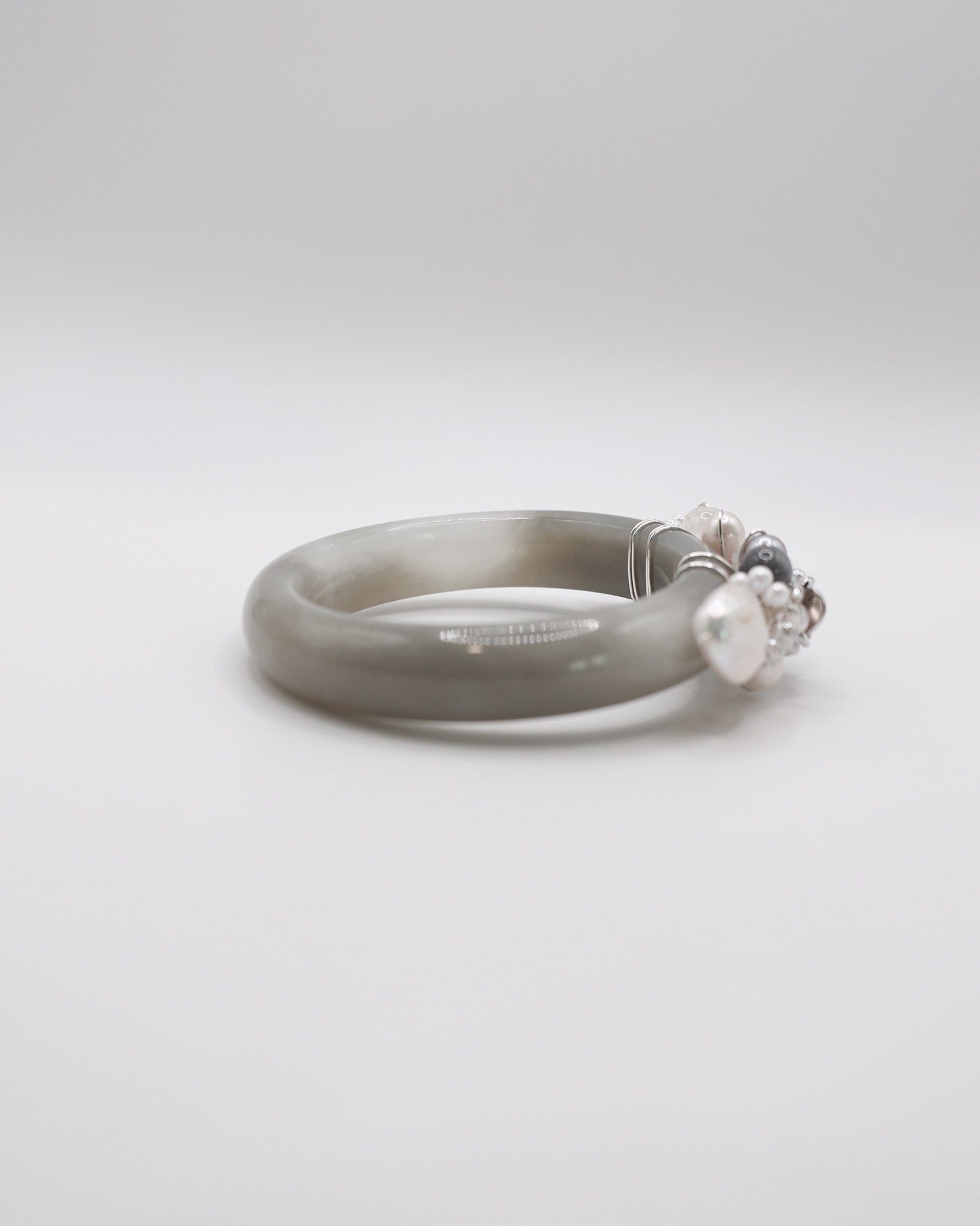 Freshwater Pearls, Type A Wuji Burmese Jade, Madagascar Moonstone, Blue Rabbit Hair, 14k Gold Plated Floral Accents, Japan Imported Glass Beads