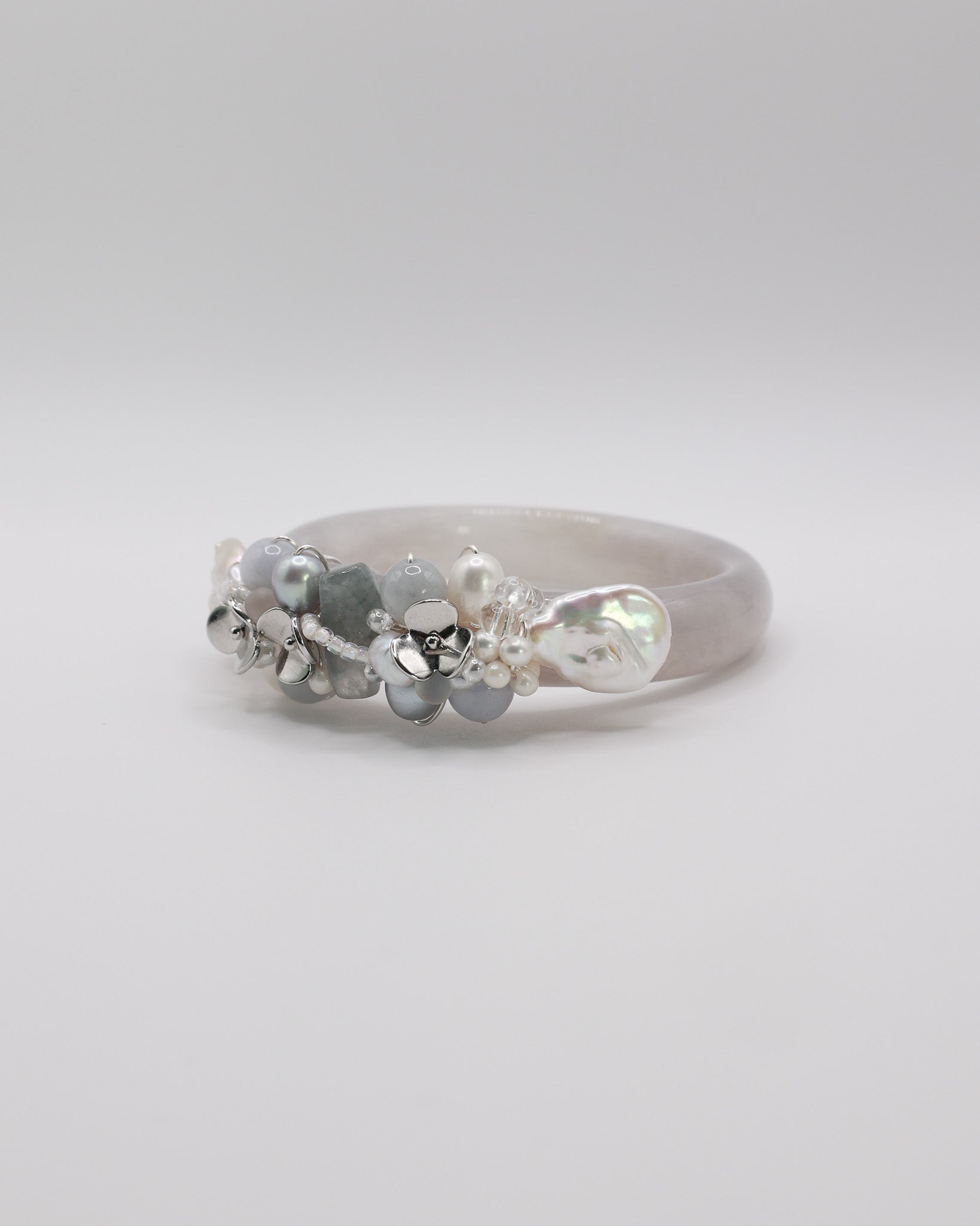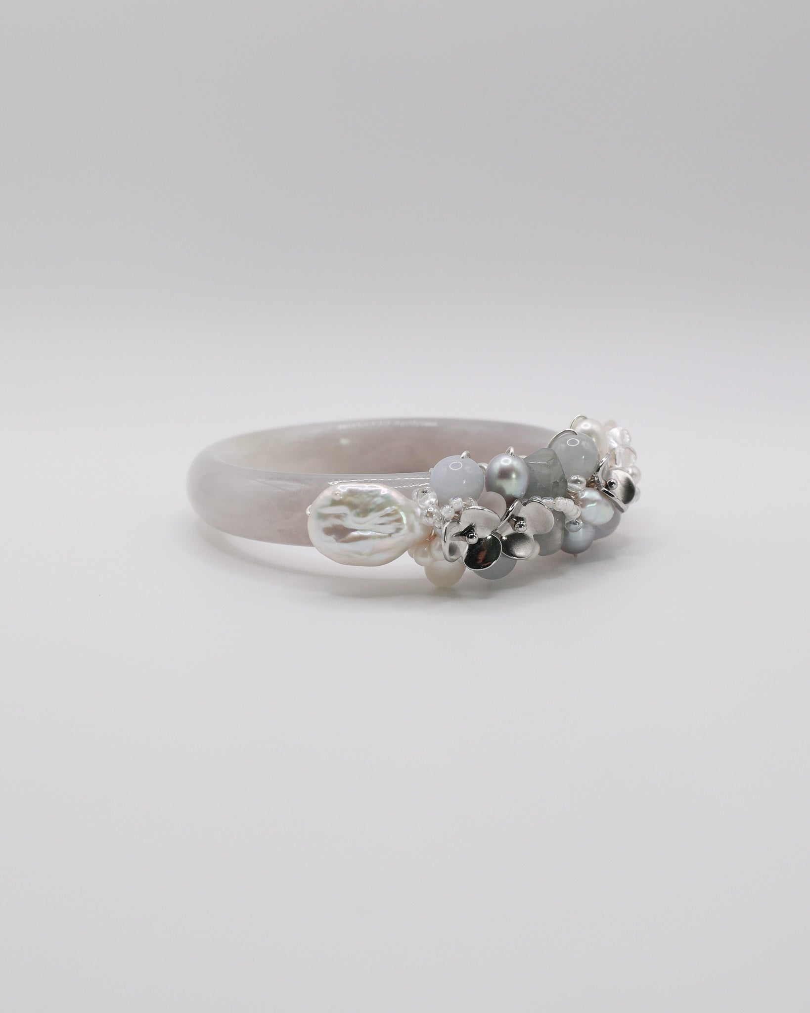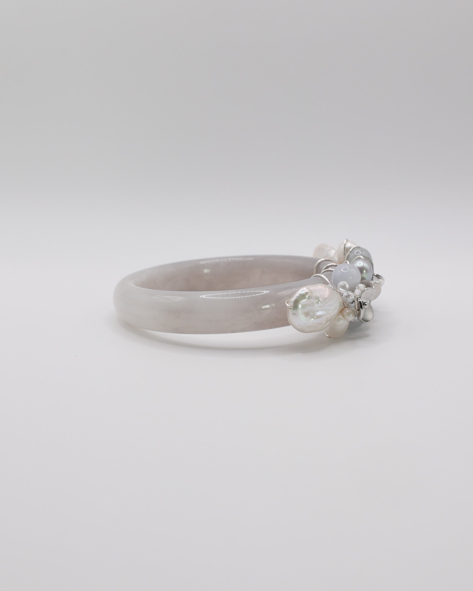 Freshwater Pearls, Type A Burmese Jade, Blue Rabbit Hair, White Phantom Quartz, 14k Gold Plated Floral Accents, Japan Imported Glass Beads