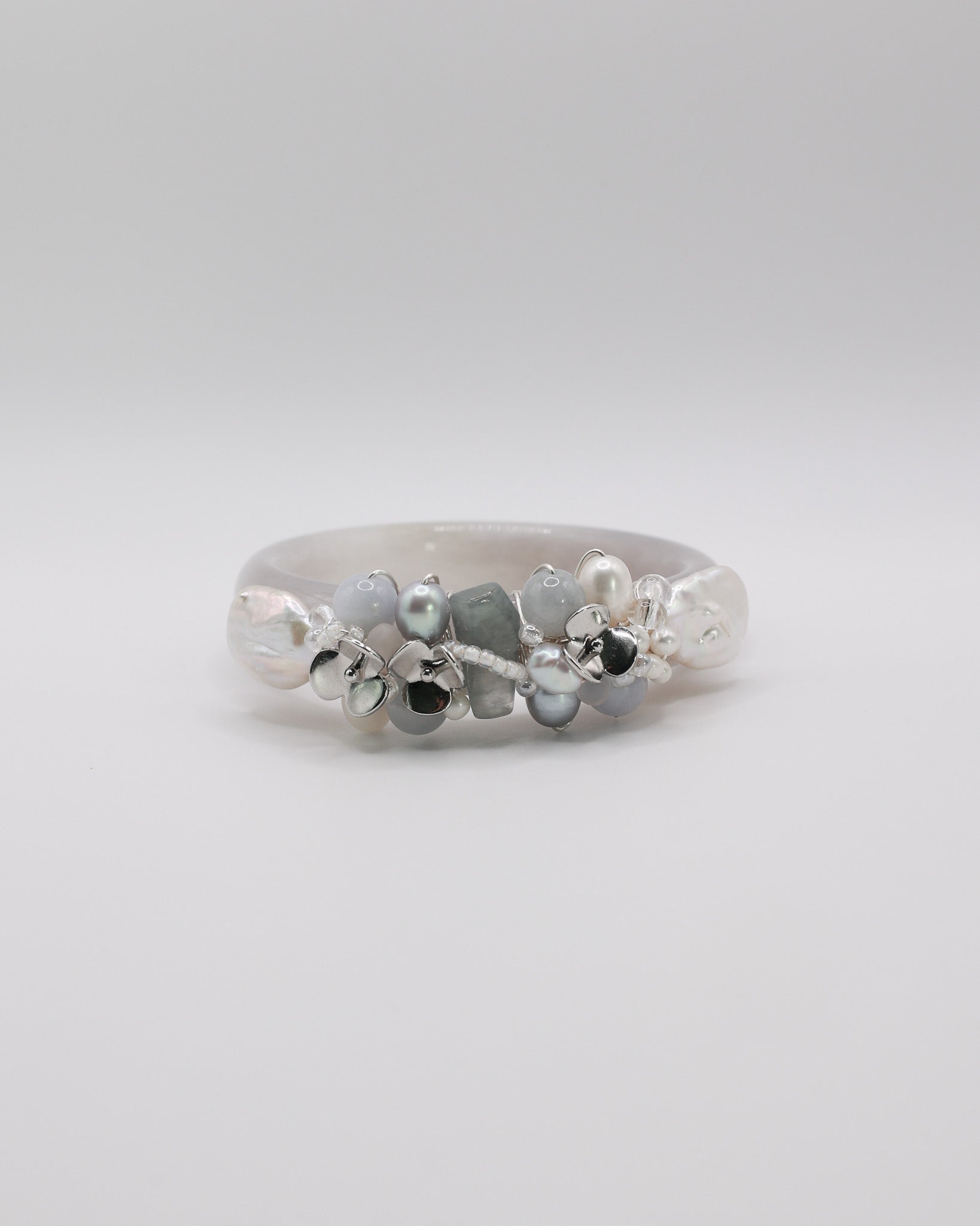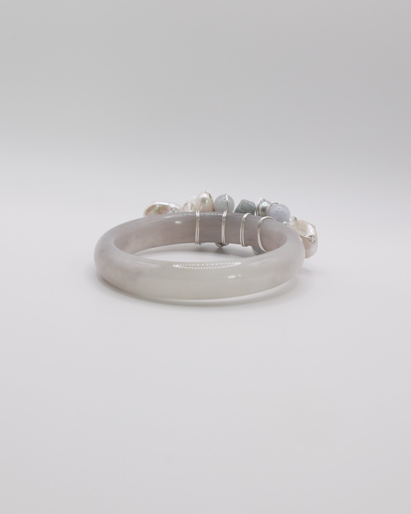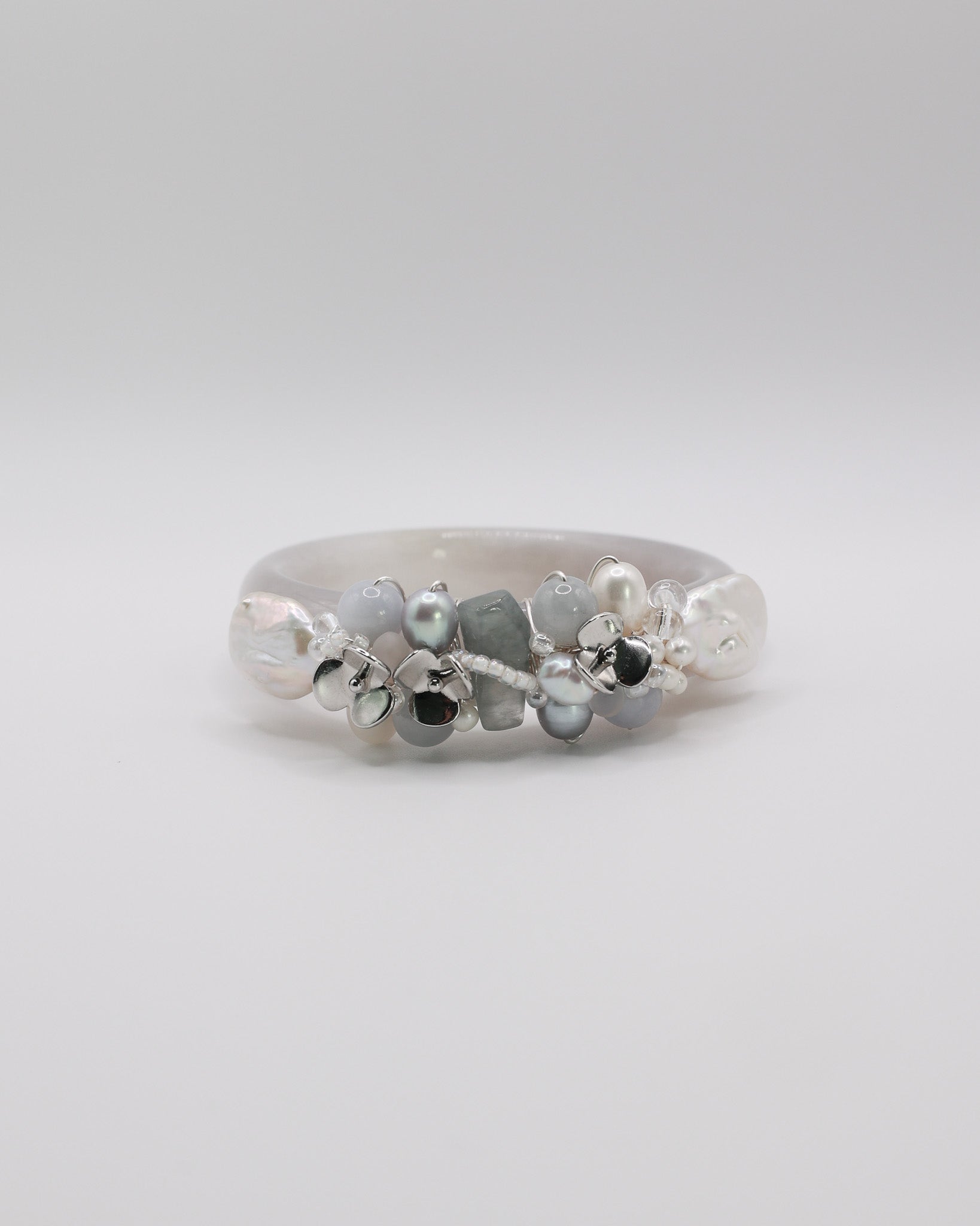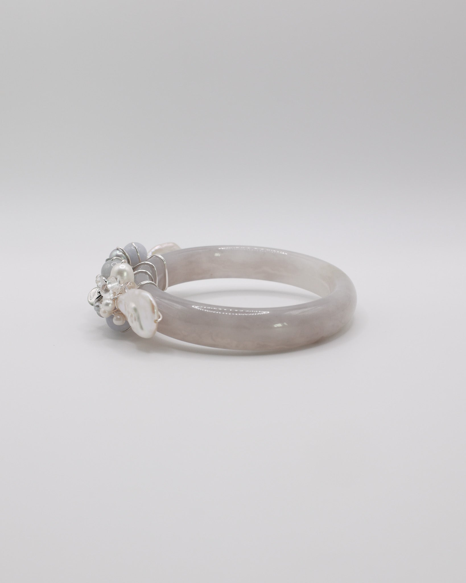 Freshwater Pearls, Type A Burmese Jade, Blue Rabbit Hair, White Phantom Quartz, 14k Gold Plated Floral Accents, Japan Imported Glass Beads