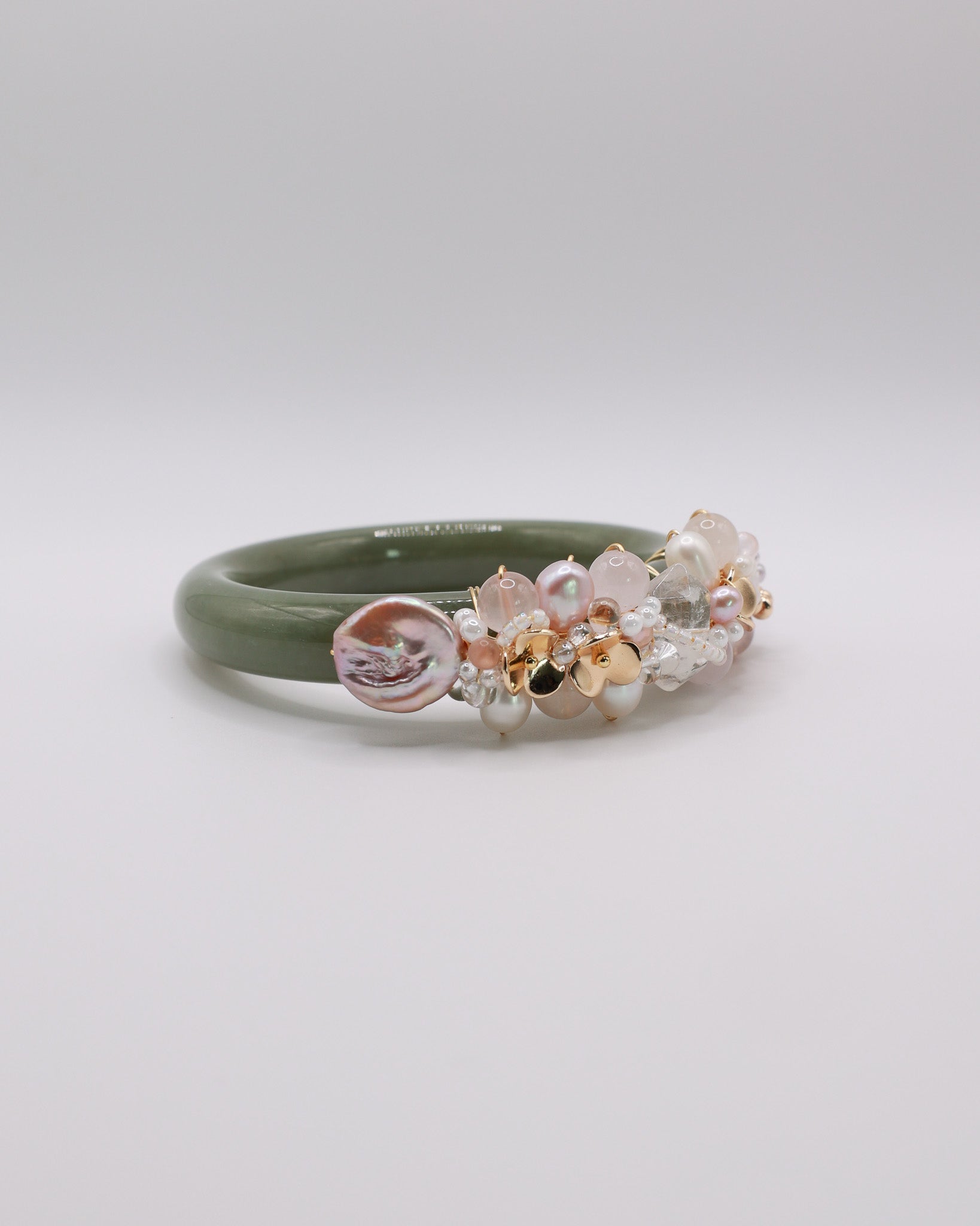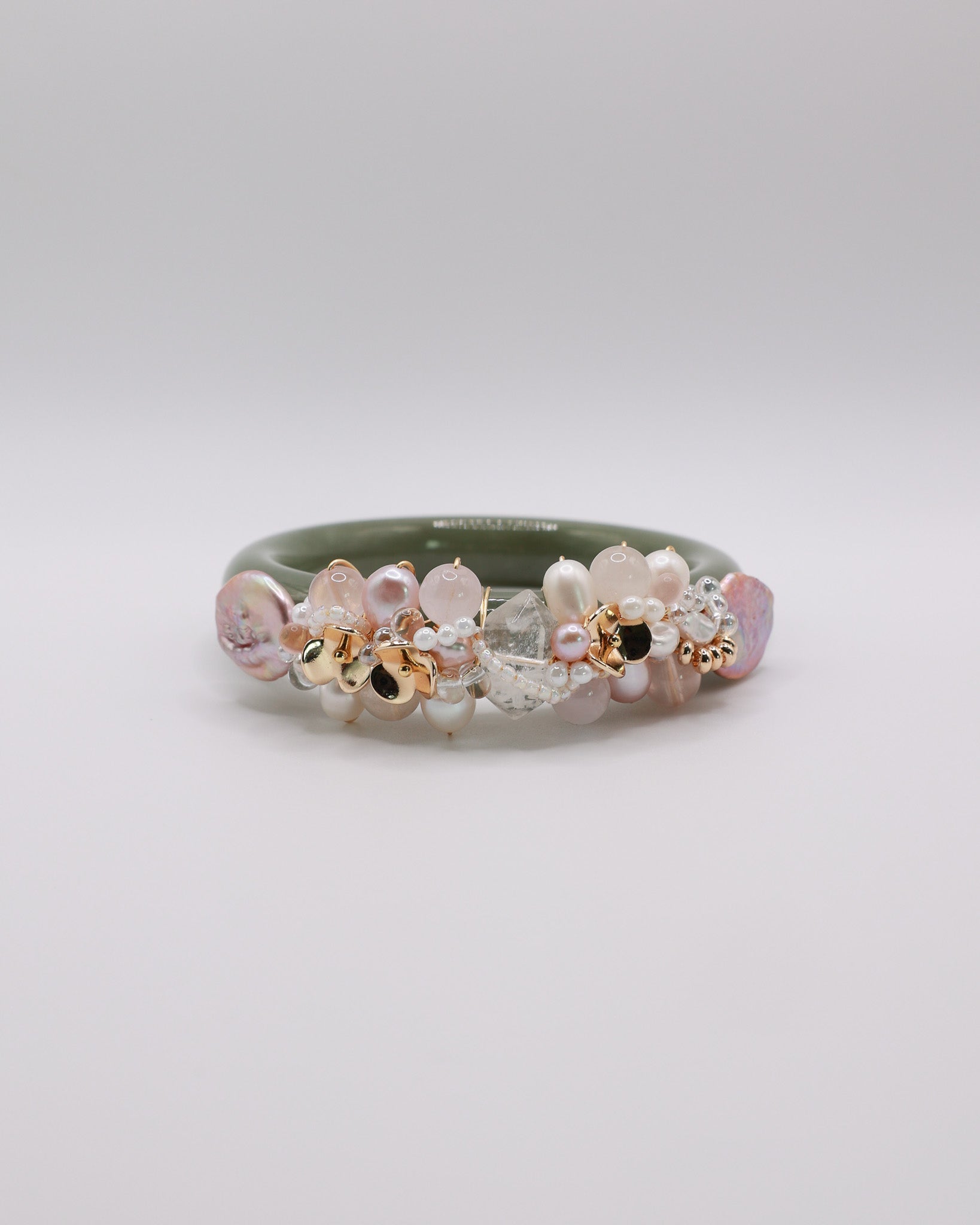 Freshwater Pearls,Rose Quartz, White Rabbit Hair, Silky Kunzite, Snow Phantom Quartz, 14k Gold Plated Floral Accents, Japan Imported Glass Beads