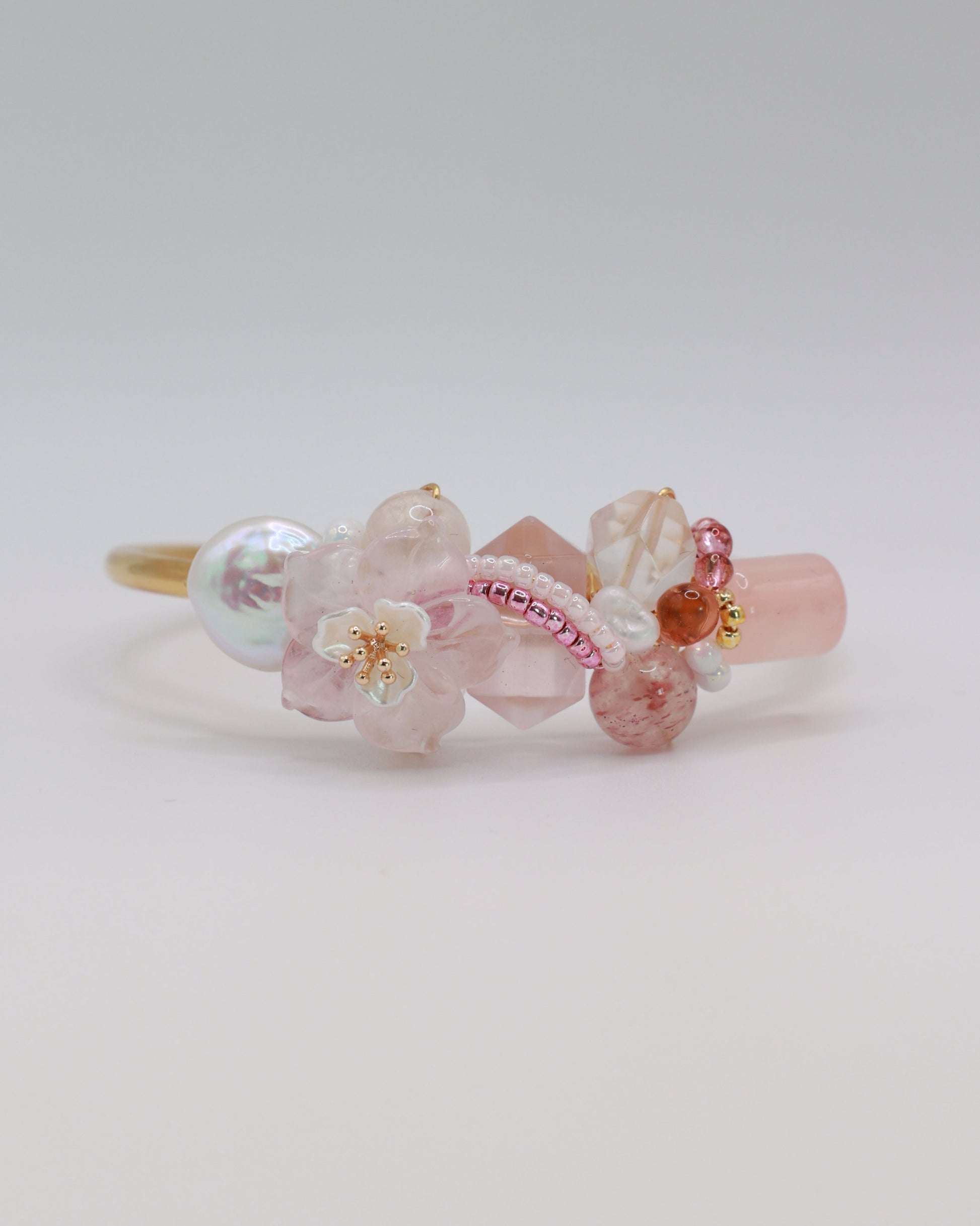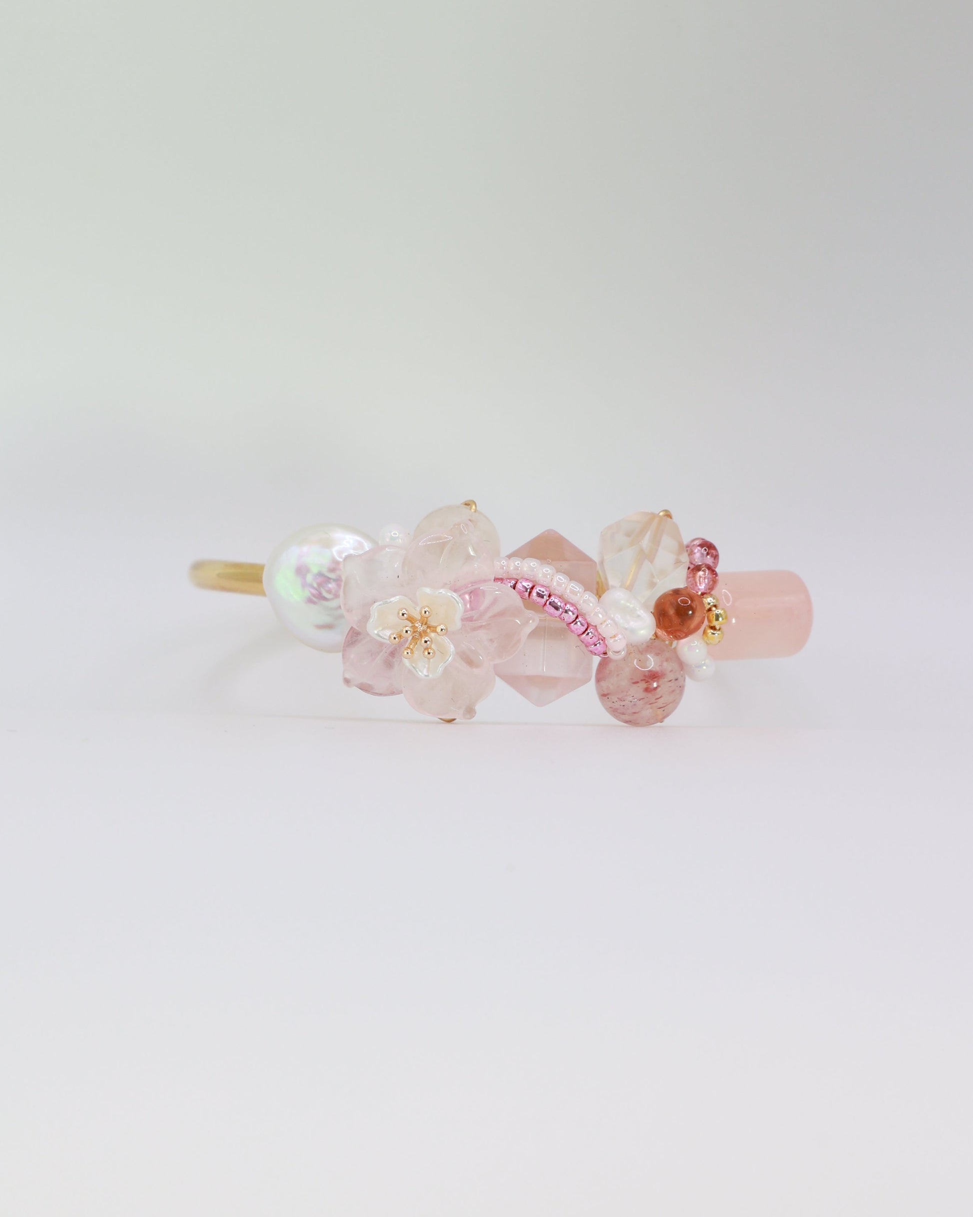 A dreamy, sweet romantic piece, Strawberry Crème blushes in soft pink tones with a rose quartz flower at its heart. Delicate and tender, it carries the gentle charm of pearls and rose quartz glowing in light.