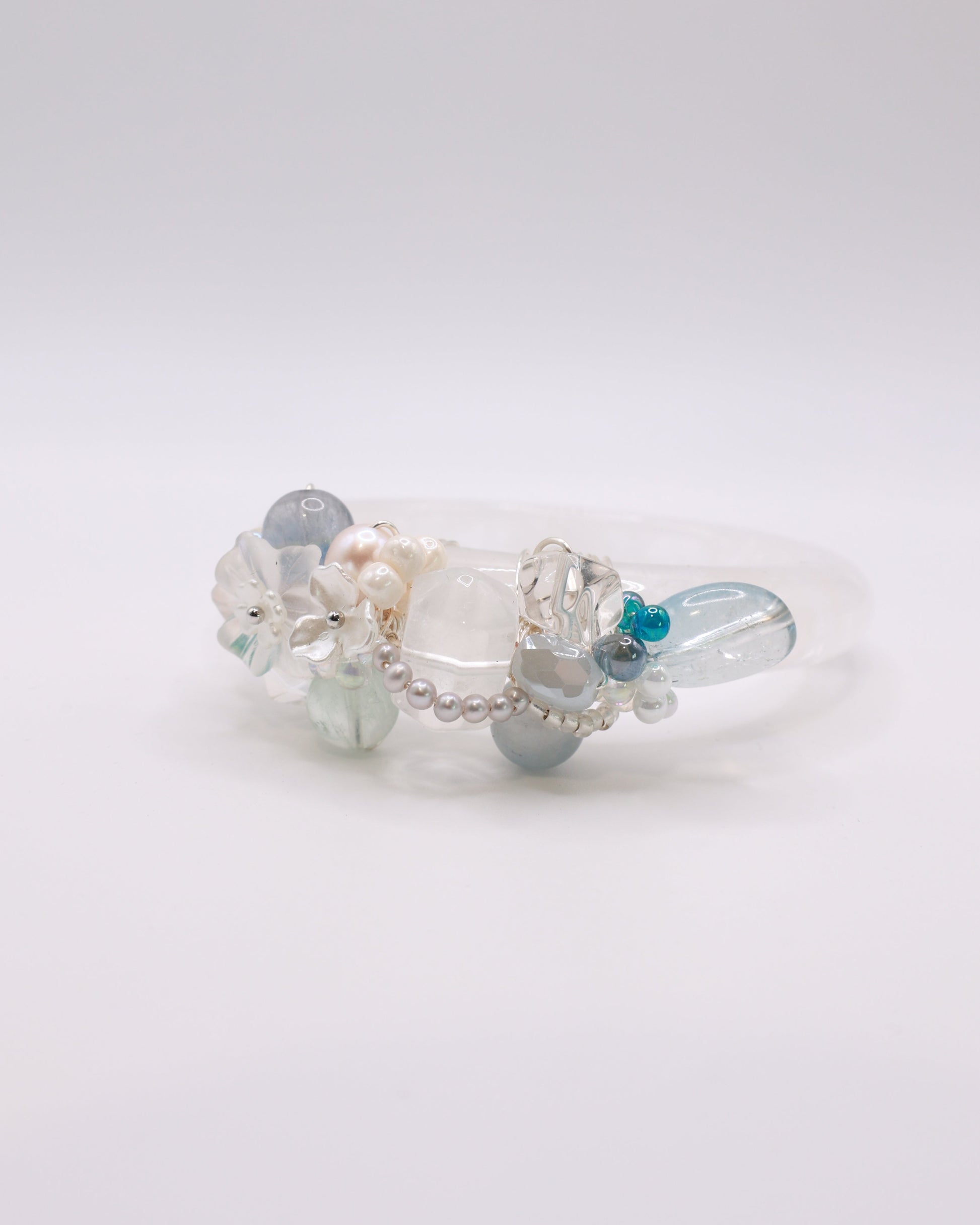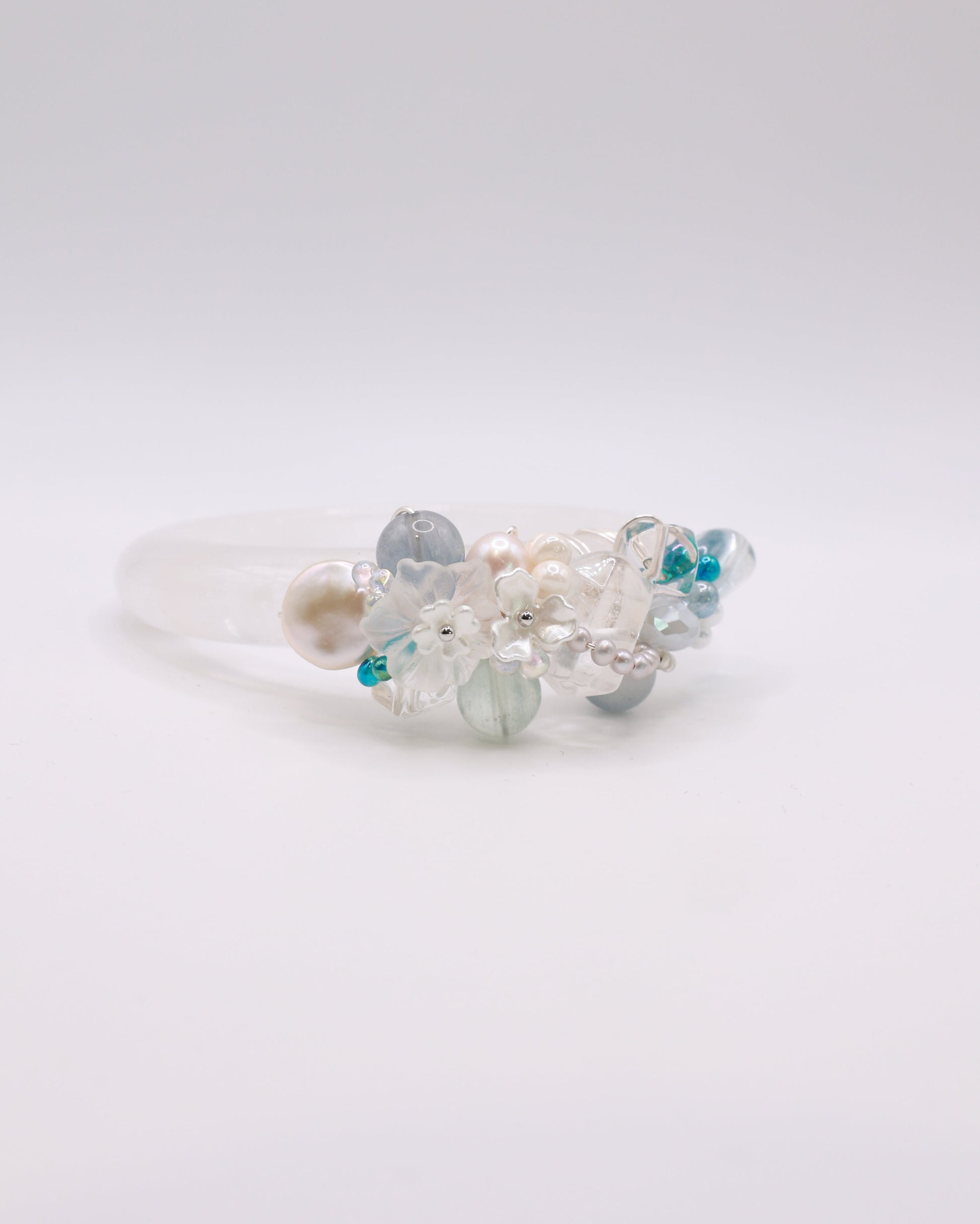 White Phantom Quartz Bangle, Freshwater Pearls, Clear Quartz Hand-Carved Flower, Clear Quartz, Silky Fluorite, White Azeztulite, Blue Rabbit Hair Quartz, Aquamarine, Japan Imported Glass Beads