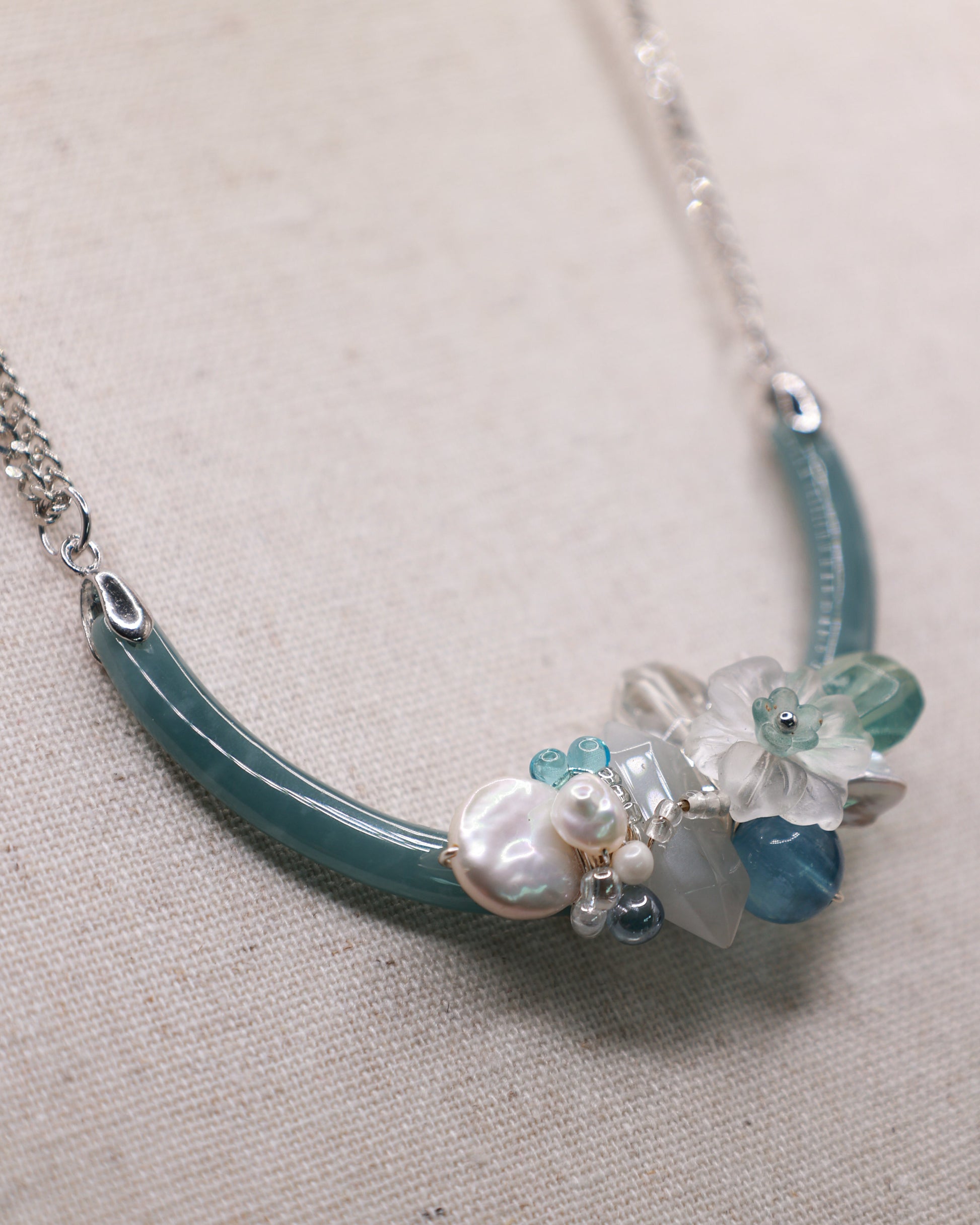 Freshwater Pearls, Blue Rabbit Hair Quartz, Devil Aquamarine, Clear Quartz, Green Fluorite, Type A Guatemalan Jade Arc Piece, Japan Imported Glass Beads