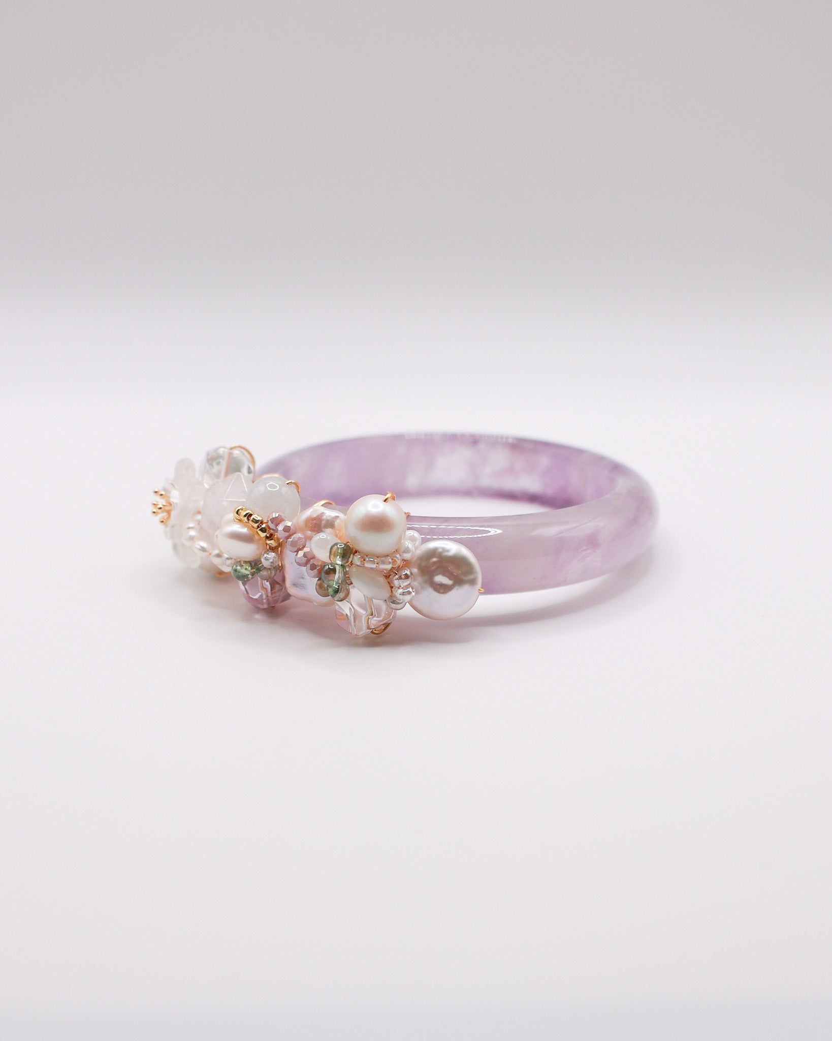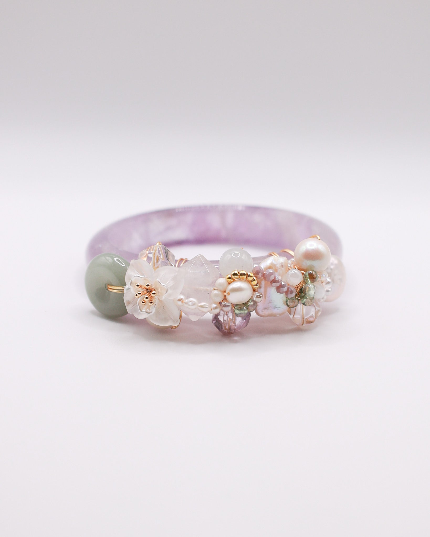 Amethyst Crystal Bangle, Type A Burmese Jade Donut, Clear Quartz Hand Carved Flower, Clear Quartz, Freshwater Pearls, Snow Phantom, Type A Burmese Jade, Bolivia Amethyst, Japan Imported Glass Beads