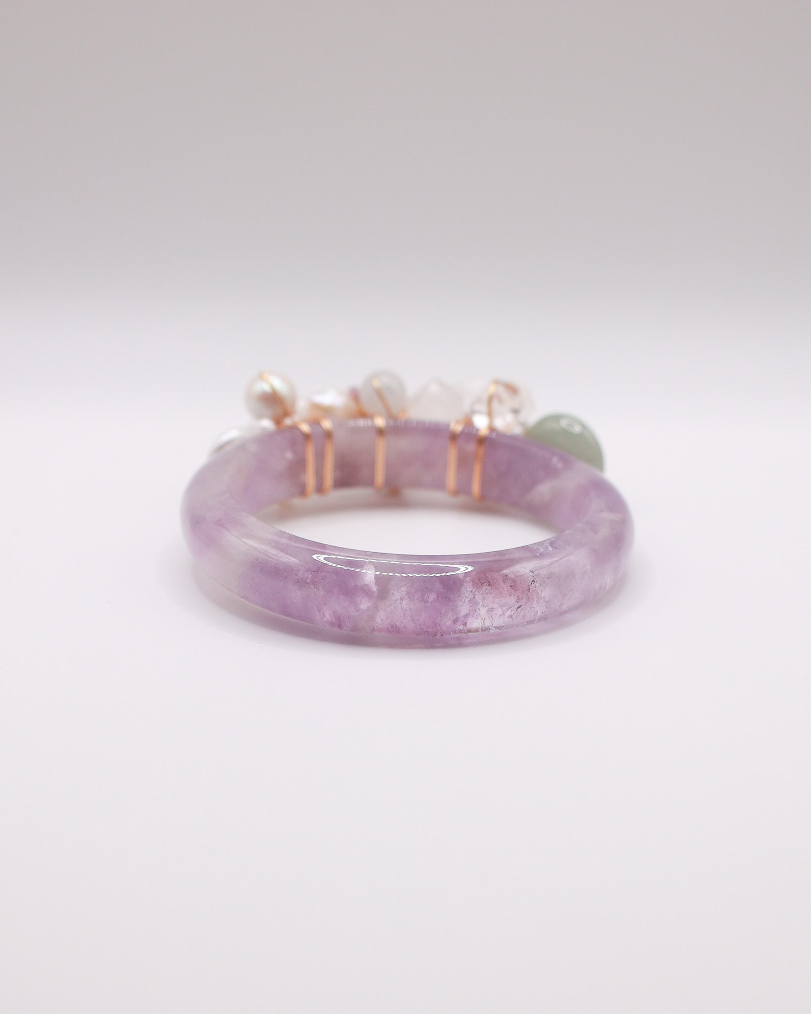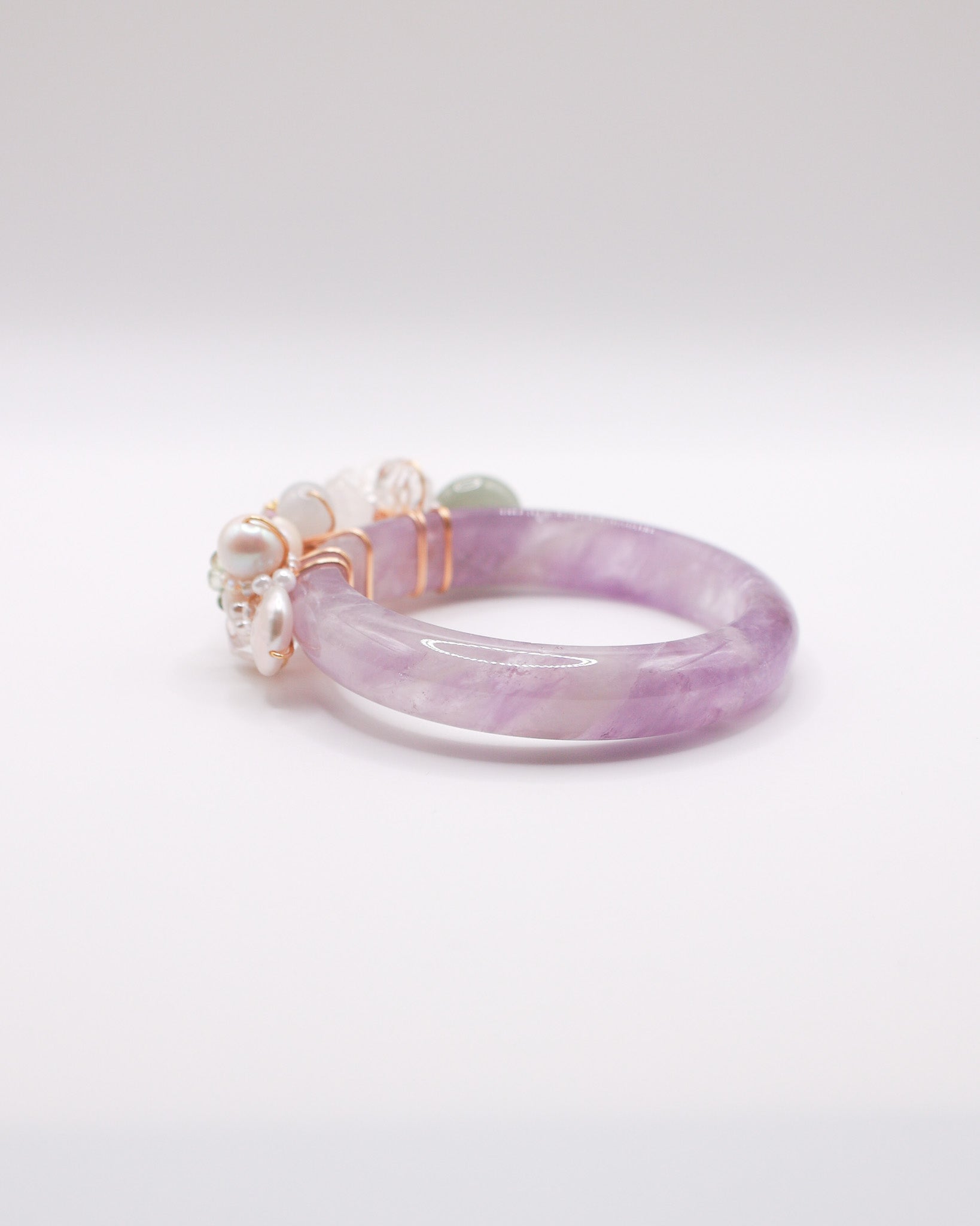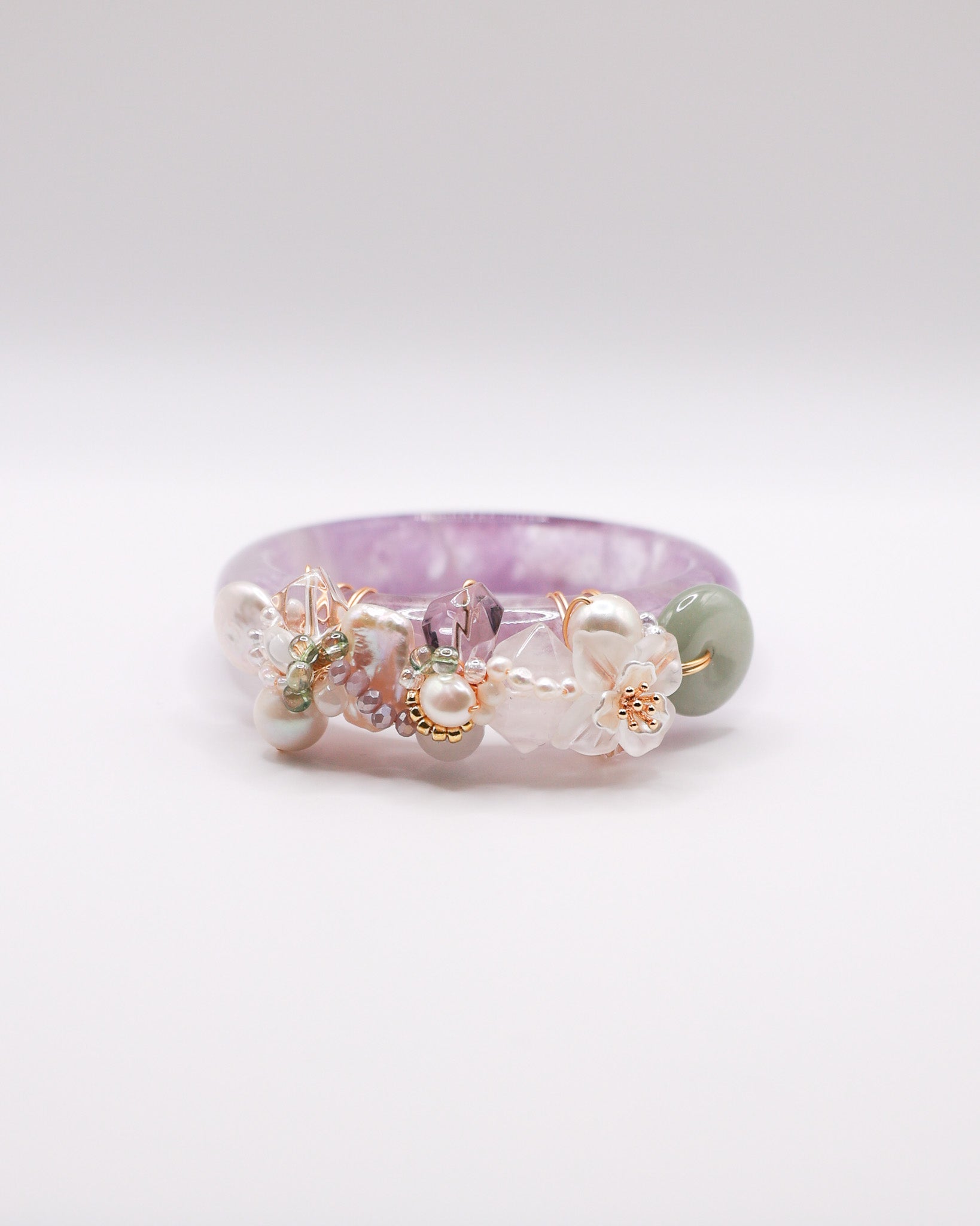 A soft veil of violet settles over this bangle, giving it a dreamy, almost celestial vibe. Amethyst tones glow gently along clear, luminous quartz, creating a mood that feels calm, contemplative, and lightly enchanted. There is a quiet depth within the purples, softened by pearly whites and misty snow phantom hues, like twilight light drifting through a still garden.